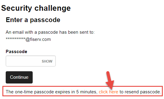 - In the Passcode field, type the passcode that we sent to your registered email address. If you did not receive a passcode, click the click here hyperlink to receive a new passcode.